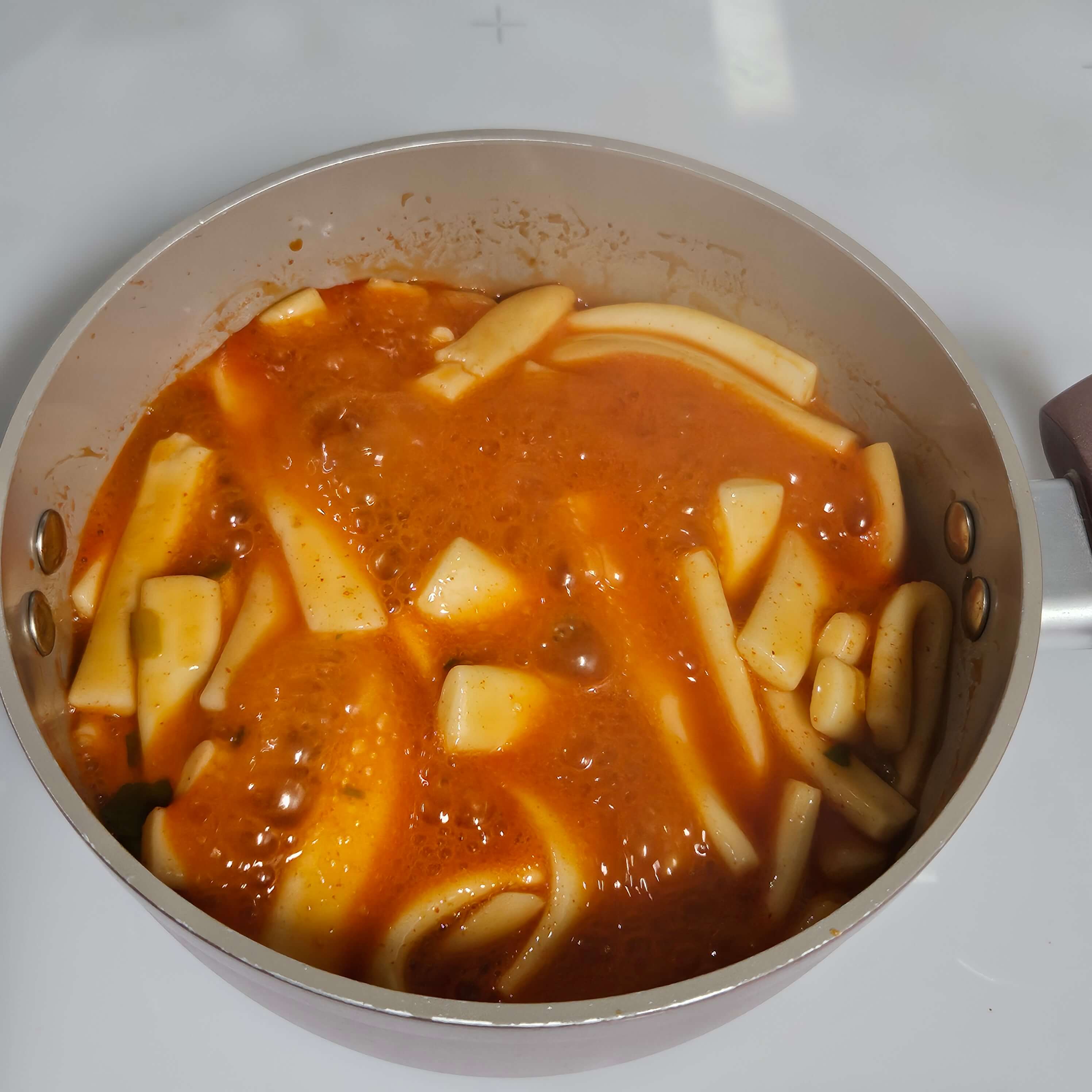 2. 팬에 물 200cc와 떡, 소스, 건더기를 넣고 조리를 시작합니다.